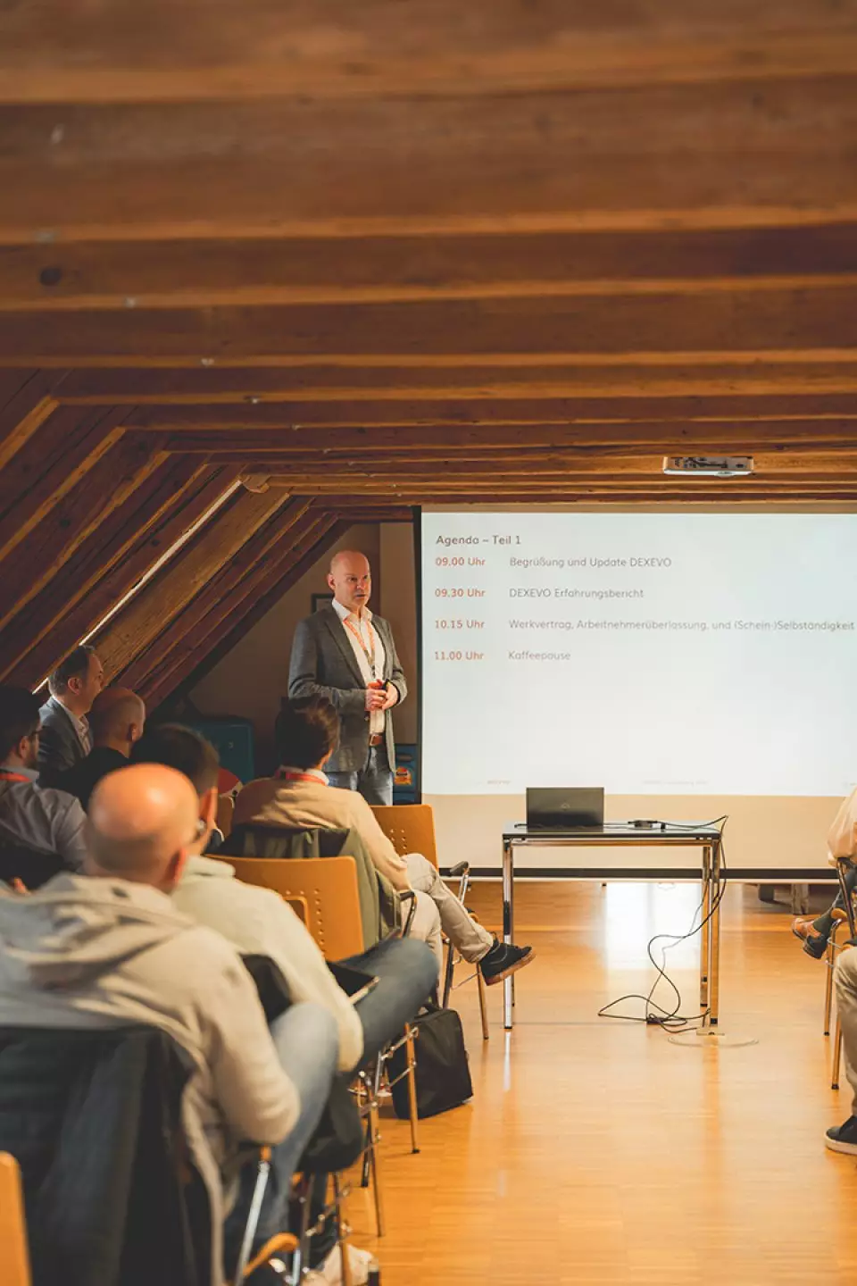 Zum Schluss ergriff Frédéric Erben – kaufmännischer Leiter bei DEXEVO – noch einmal das Wort und sprach über aktuelle Marktentwicklungen. Und auch darüber, wie diese sich auf die Compliance auswirken. Gemeinsam mit einem der führenden Nachunternehmermanagern Deutschlands tauchten er und die Zuhörer in die Anforderungen hinsichtlich der Prüfung und Plausibilisierung ein. Die Beispiele aus der Praxis machten deutlich, wie wichtig es ist, Nachunternehmer und ihre Dokumente zu prüfen. Sein Aufruf, dass alle Auftraggeber der Bauwirtschaft durch die gewissenhafte Prüfung und Vergabe einen wichtigen Beitrag zu Transparenz und einem fairen Wettbewerb leisten können, fand großen Zuspruch. Genau deshalb ist es so wichtig, dass sich die verantwortlichen Nachunternehmermanager untereinander austauschen können.