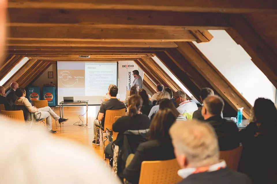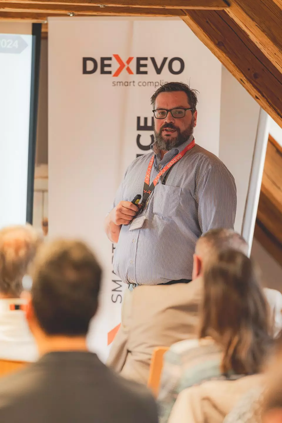 Perfekt eingestimmt begann für die Teilnehmer am Freitagmorgen der Hauptteil der Veranstaltung. Nach kurzen Willkommensworten von Daniel Schmidt erhielten die Zuhörer einen Überblick zum Ablauf des Tages. Anschließend stellte er das DEXEVO-Kernteam vor und gewährte Einblicke in die aktuellen Entwicklungen in Unternehmen und Produktportfolio. Unter anderem, wie künftig KI-Unterstützung bei der Verwaltung und Auditierung von Bescheinigungen zum Einsatz kommen wird. Aber es wird weitere Neuerungen geben, auf die sich Kunden und Partner in 2024 freuen dürfen: So stehen neben dem Facelift und der Weiterentwicklung der DEXEVO WARP-Plattform auch die Beta-Version von FACT in der Cloud im Fokus.