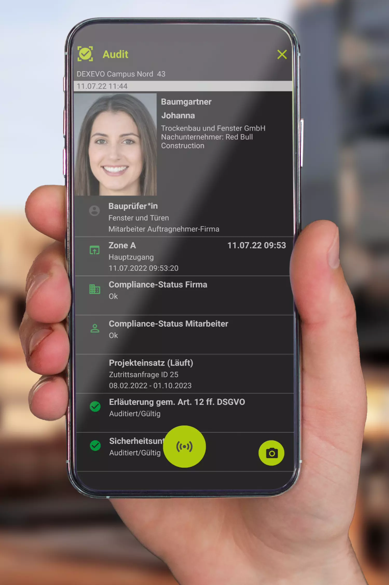 Mit Hilfe der Datenübertragung in Echtzeit können jederzeit Personen auf der Baustelle nach Ihrem Ausweis gefragt und sofort überprüft werden. Die Baustellenausweise werden durch das Smartphone eingelesen und relevante Daten wie Firma, Name, Ausweisgültigkeit oder Anwesenheitsstatus angezeigt. Auf einen Blick kann auch überprüft werden ob, alle wichtigen Dokumente wie der Nachweis einer Mindestlohnbescheinigung vorliegen.